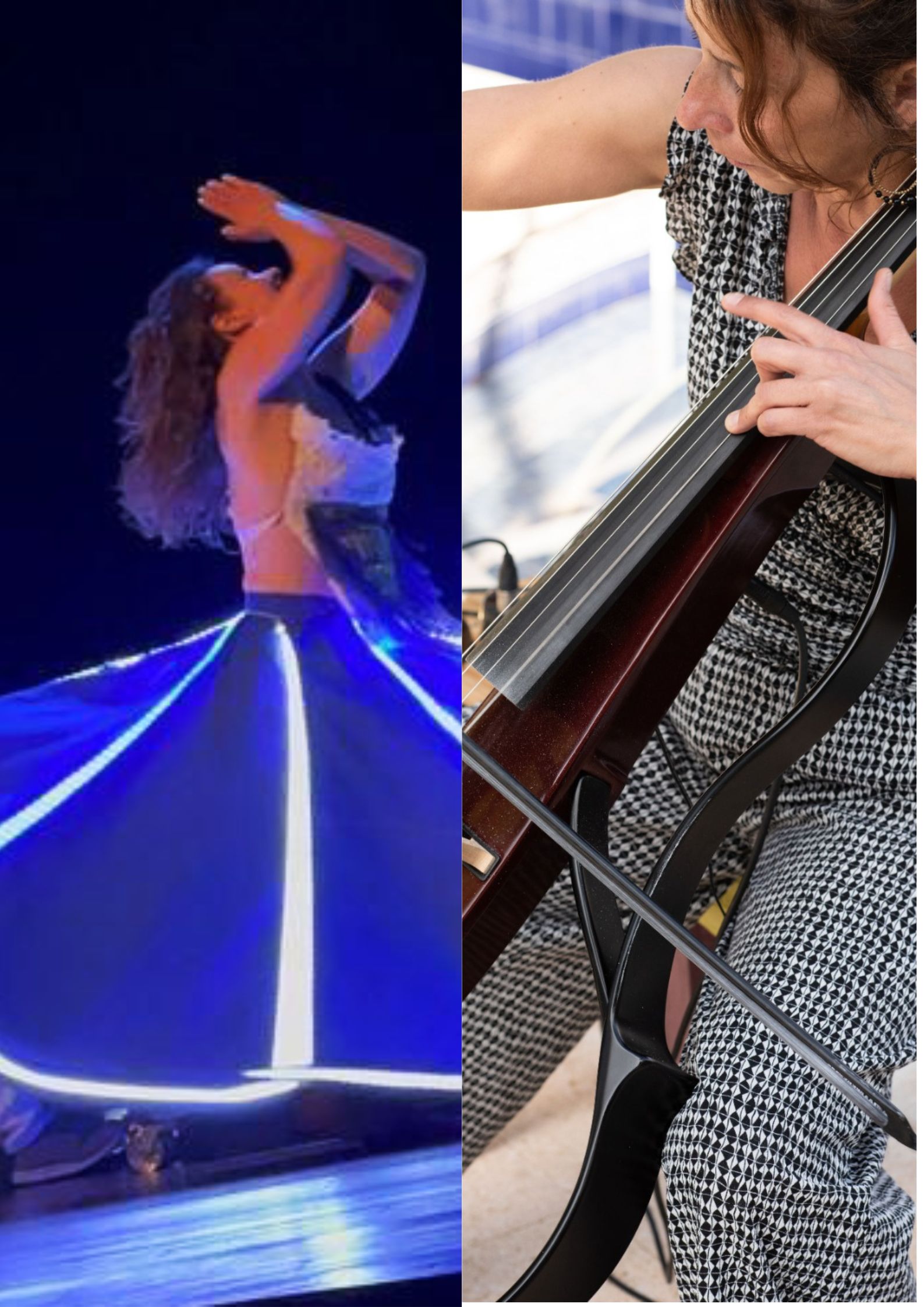 Susana Rozsa al chelo acompaña unas envolventes melodías a la vez que Susana Paz entra en el sentir de la música a través de la danza circular con su visual falda de luces. Un espectáculo innovador que fusiona la ancestralidad del giro con el carácter contemporáneo de la música. La conexión entre las dos artistas que improvisan cautivará al espectador haciéndole entrar en el trance de ambas.